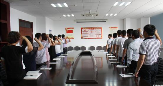 “我志愿加入中国共产党,拥护党的纲领,遵守党的章程……”座谈会以全体党员重温入党誓词开始。全体党员整齐地排成两列,右手握拳,面对党旗庄严宣誓。宣誓结束后,王章敬带领大家学习了习近平总书记在7月1日庆祝中国共产党成立95周年大会上的重要讲话,并对其中的要点进行了详细解读。预备党员楚存红作了思想汇报,全体党员对下一步如何更好地开展党建工作献言献策。