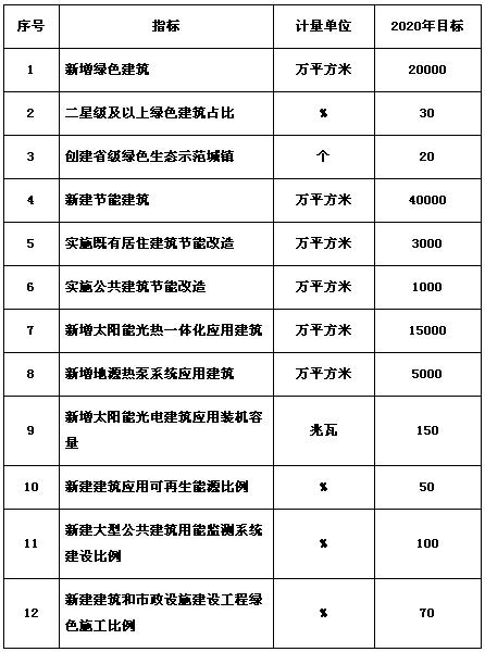 ——绿色建筑。县级及以上城市规划建设用地范围内全面执行绿色建筑设计标准,新增绿色建筑2亿平方米以上,二星级及以上绿色建筑比例达到30%以上。新建城区全部按照绿色生态城区要求进行规划、设计、建设、管理,创建省级绿色生态示范城镇20个以上。