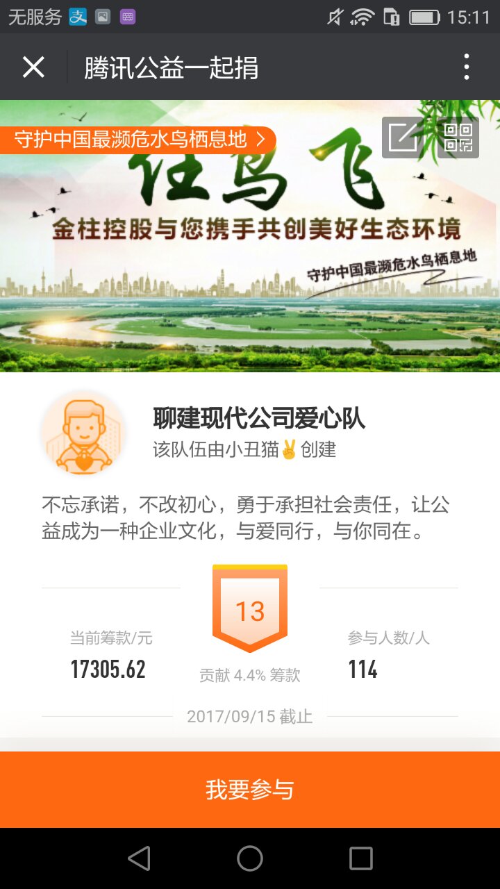 阿拉善SEE“守护栖息地任鸟飞”项目,是守护中国最濒危水鸟及其栖息地的一个综合性生态保护项目。该项目以超过100个亟待保护的湿地和24种珍稀濒危的水鸟为优先保护对象,以科学调查为依据,提出通过民间机构发起行动、企业投入、社会公众参与的方式,搭建与官方自然保护体系互补的民间保护网络,建立保护示范基地,进而撬动政府、社会的相关投入,共同守护中国最濒危水鸟及其栖息地。山东聊建现代建设有限公司作为参与此次活动的爱心队伍,积极组织此次捐款活动,为更好地推动慈善事业的发展,奉献爱心,为保护大自然贡献力量。