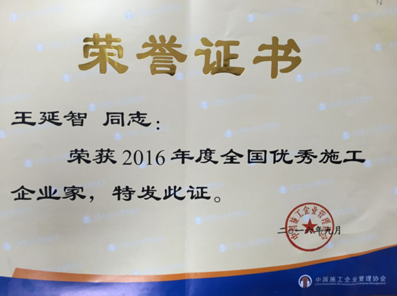 9月27日,由中国施工企业管理协会主办的“2016年施工企业领军人物峰会”在北京召开。在会上,山东聊建现代建设有限公司董事长王延智被授予“全国优秀施工企业家”荣誉称号。